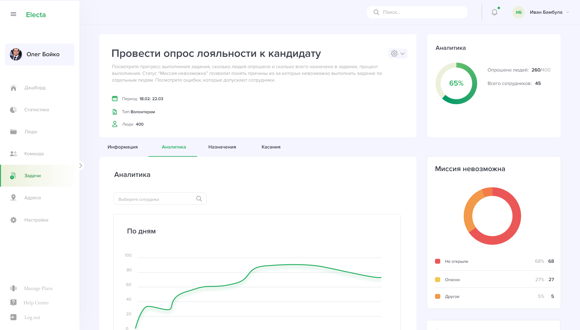 С помощью Electa вы можете управлять предвыборной агитацией онлайн: планировать задачи, создавать пошаговые инструкции, координировать действия мобильных команд агитаторов и волонтеров, контролировать результаты.